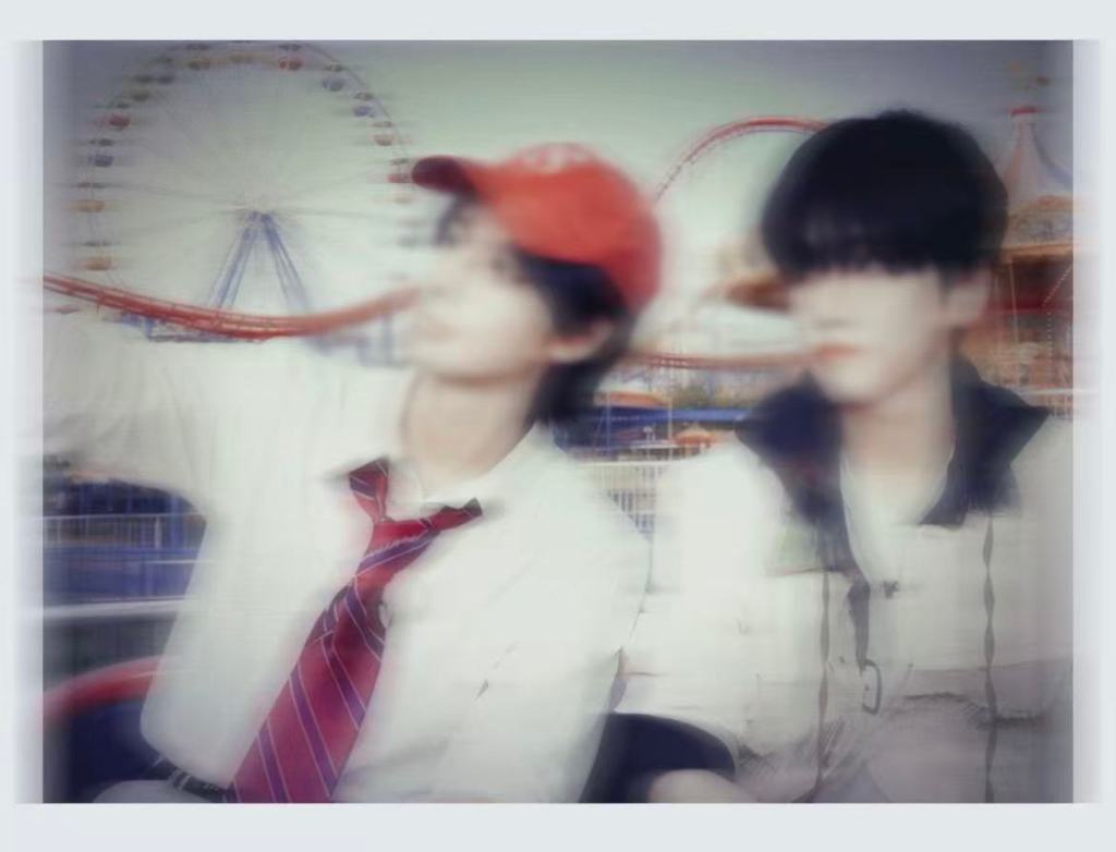 一张双人合照,照片上是一个戴着鸭舌帽身着校服衬衣的学生,旁边坐着一位稍矮一些的男生。背景看起来好像在游乐园,看不太清长相,照片上甚至还有好多划痕……背后的拍摄时间在八年前。